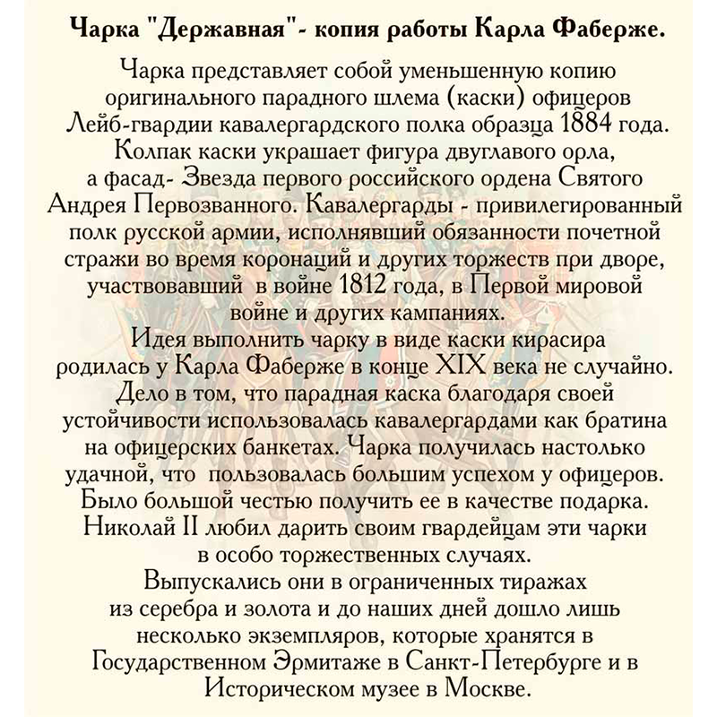 Чарка представляет собой уменьшенную копию оригинального парадного шлема (каски) офицеров Лейб-гвардии