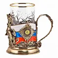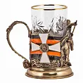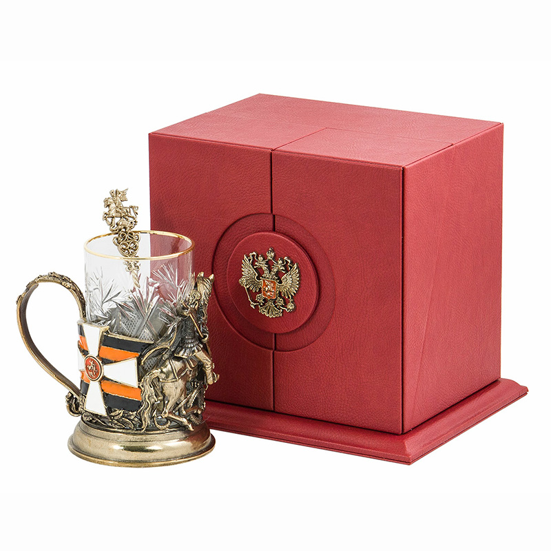 Восстановленный орден Святого Георгия с 2000 года - высшая награда Российской Федерации. На подстаканнике изображены знак и звезда ордена Святого Георгия согласно действующему статуту ордена. Слева от объемного бронзового изображения Георгия - знаменитый "Георгиевский крест" - знак ордена на орденской георгиевской ленте, справа - звезда ордена на фоне флага России.