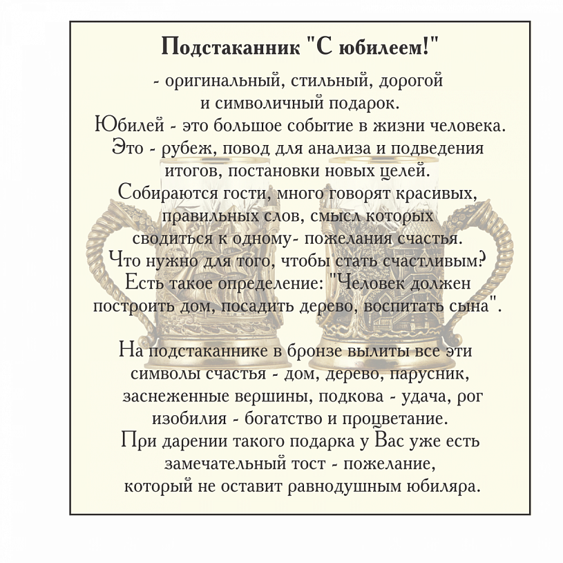 На подстаканнике в бронзе вылиты все эти символы- дом, дерево, парусник, заснеженные вершины, подкова- удача, рог изобилия- богатство и процветание. При дарении такого подарка-символа, у Вас уже есть замечательный тост-пожелание, который не оставит равнодушным юбиляра.