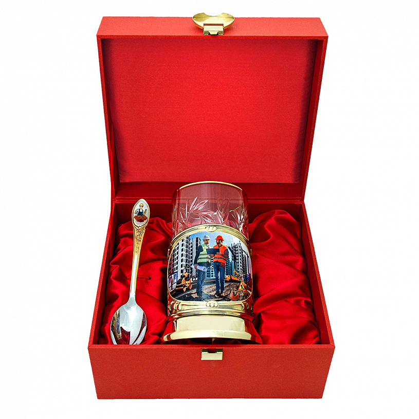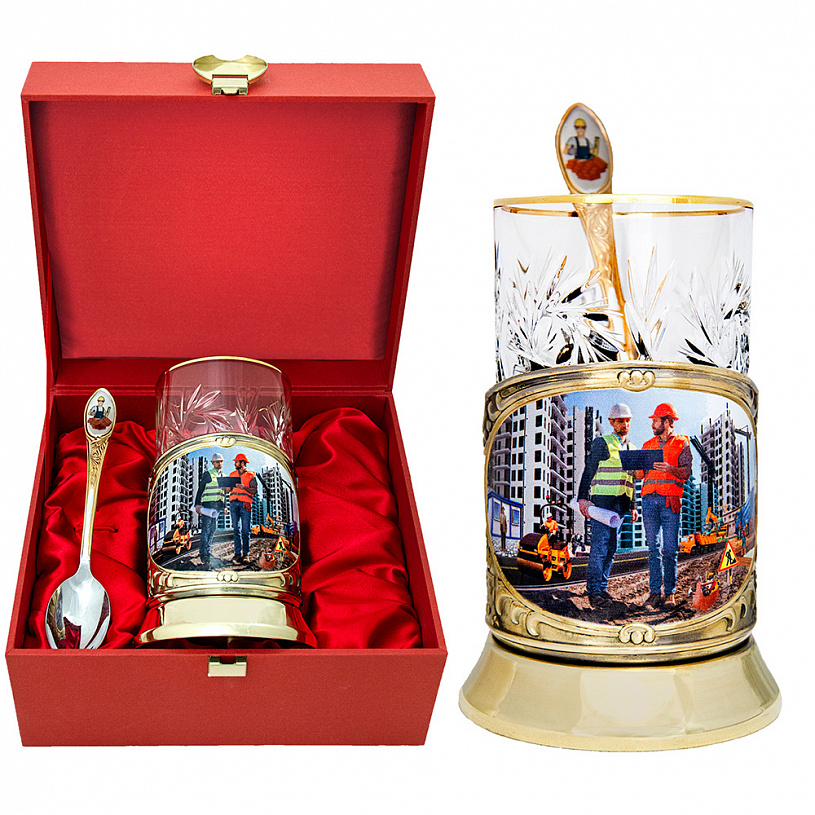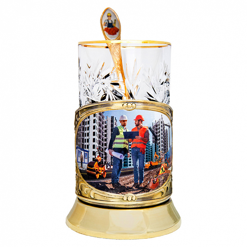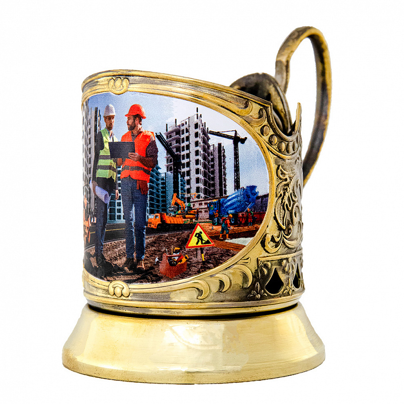 Подстаканник «Строители» - прекрасный подарок для представителя любой из многочисленных специальностей этой древней и мирной профессии. Архитектор и главный инженер, сварщик и дорожный рабочий, каменщик, крановщик и др.– талантливые и трудолюбивые труженики, совершают свой созидательный подвиг: чертят, возят, носят, месят, режут, варят, роют, крепят. Управление осуществляет «бог» стройки – прораб, который только что вышел из бытовки и зорким, наметанным взглядом осматривает свои владения. Все они изображены в процессе созидания чего-то нового, нужного и важного.