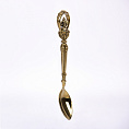 В правой руке держит меч, в левой — щит, укрывающий корону, скипетр и державу.
