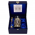 Материал: бронза, точное объемное литье с последующей декоративно-художественной обработкой, тонировка, патинирование. Ручная работа. Высота — 13 см, диаметр — 9 см, ширина с ручкой — 13 см. Стакан из хрусталя с золотым ободком. Вес со стаканом — 0,9 кг.