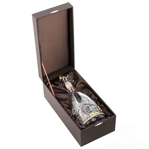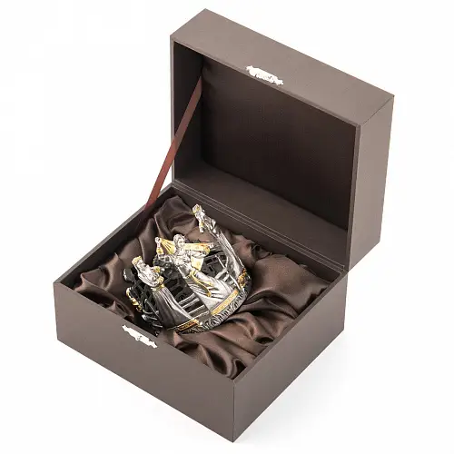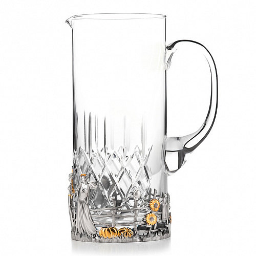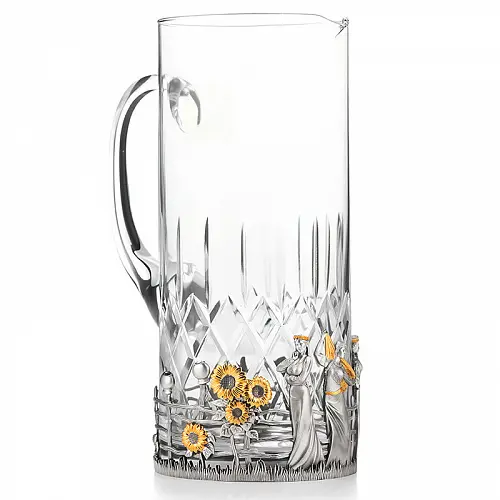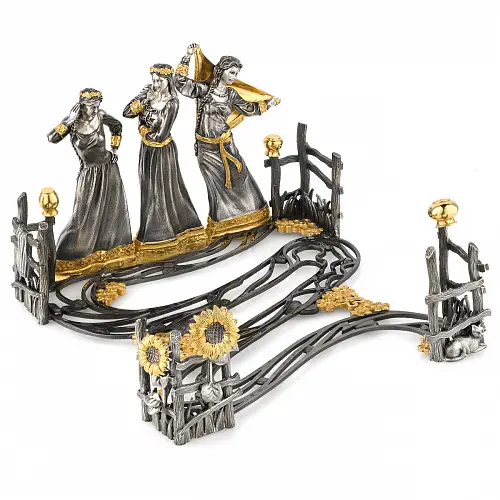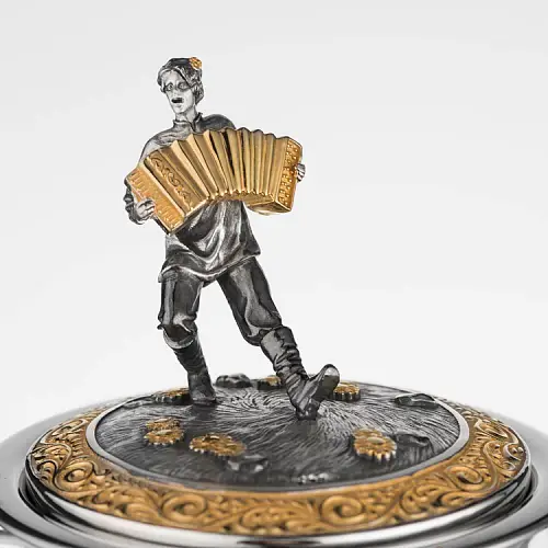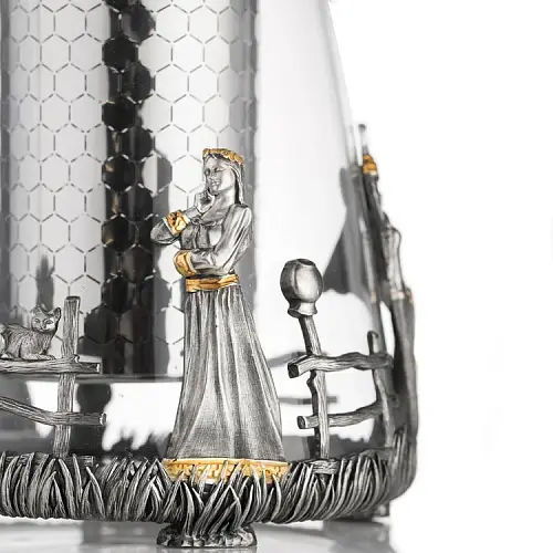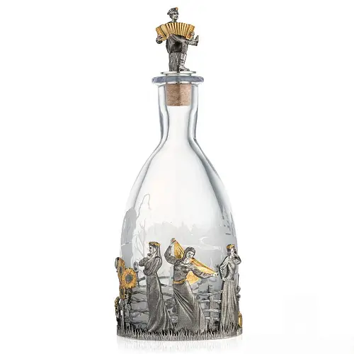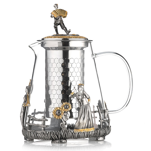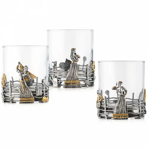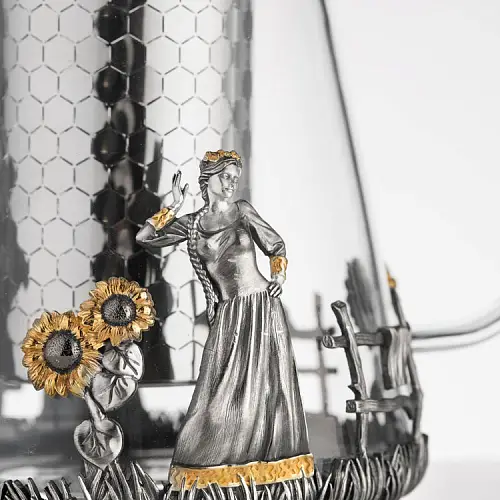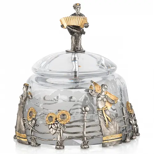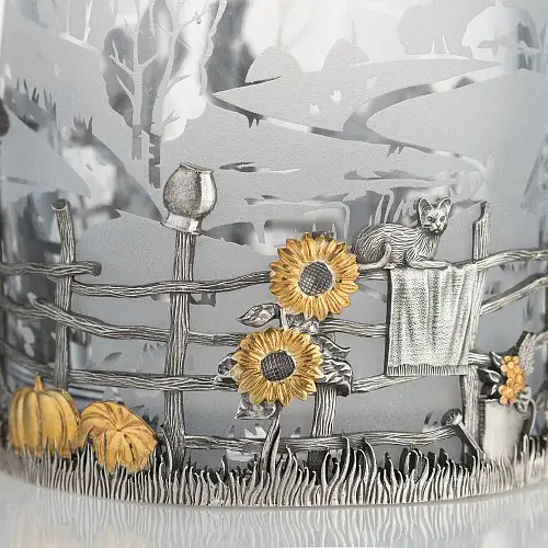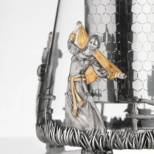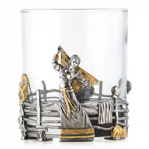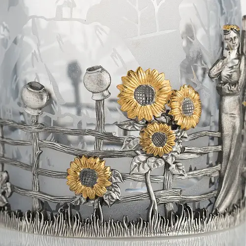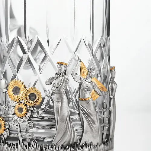 Роскошный подстаканник выполнен по мотивам народной песни «Выйду на улицу, гляну на село, девчата гуляют, и мне весело». Стакан в комплекте изготовлен из хрусталя.