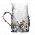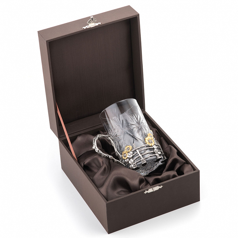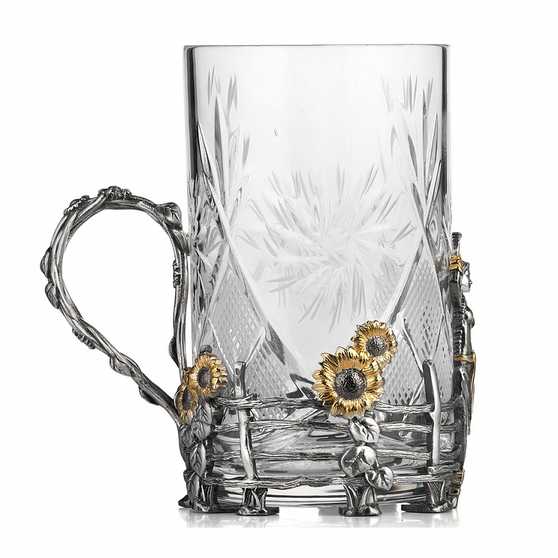 Роскошный подстаканник выполнен по мотивам народной песни «Выйду на улицу, гляну на село, девчата гуляют, и мне весело». Стакан в комплекте изготовлен из хрусталя.
