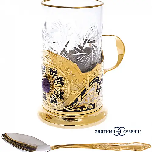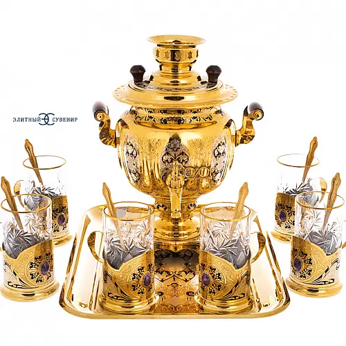 Комплектация : поднос, труба , фарфоровые чайник и сахарница, 4 латунных подстаканника, 4 хрустальных стакана, 4 ложки.