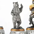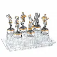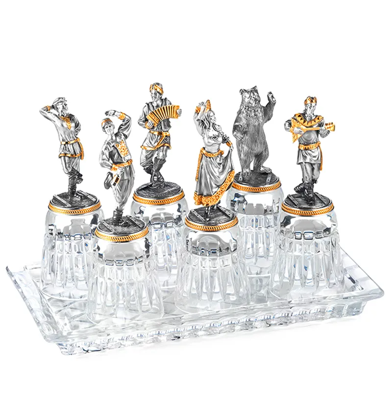 Набор для употребления водки состоит из 6 рюмок, объемом 25 мл., и подноса. Сосуды изготовлены из хрусталя. Изделие посвящено русской пословице «Пляши, да не заплясывайся», и представляет собой веселящихся персонажей на деревенской ярмарке (все сверх на голову). Сюжет данного сета был очень популярен в русском антикварном серебре начала XX века, и данной работой мы показываем приемственность традиций. Фирменная коробка в комплекте.