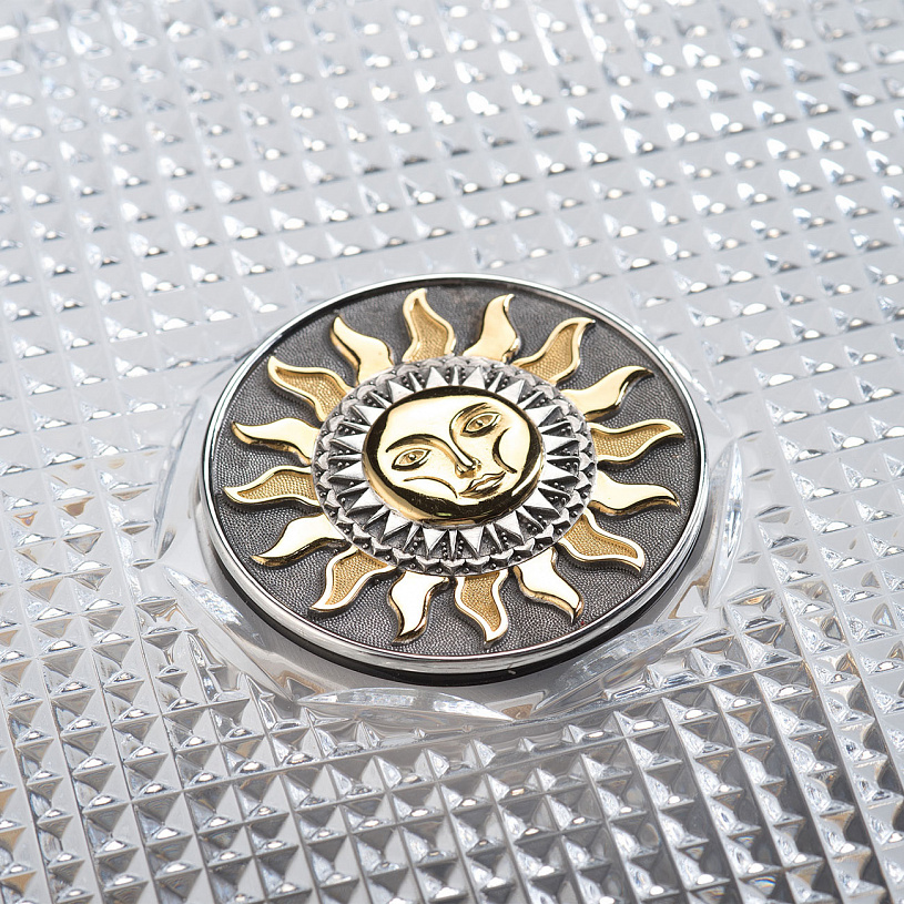 Хрустальное блюдо с бортиками для двадцатисантиметровых блинов прикручивается к ножке, стилизованной под печную трубу. Блин – символ Солнца в русской традиции, поэтому закручивающий элемент несет на себе солнечную символику. Считалось, если на Масленицу напечь блинов больше всех, то в доме поселится счастье. Блины, которые выпекали на Рождество, символизировали богатый урожай в следующем году. Блины, которые называли “тряпками богов”, пекли на Вознесение. На Спас пекли блины из муки нового урожая и обязательно с маком, орехами и яблоками. Блины, которые выпекали на Покров, должны были “запечь” все углы от зимней стужи и ветров. В больших количествах пекли блины к свадьбе.