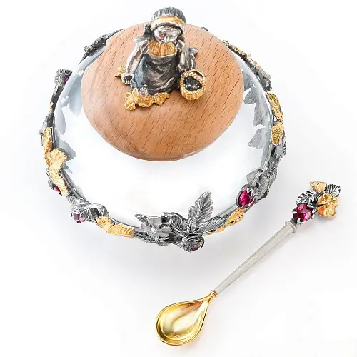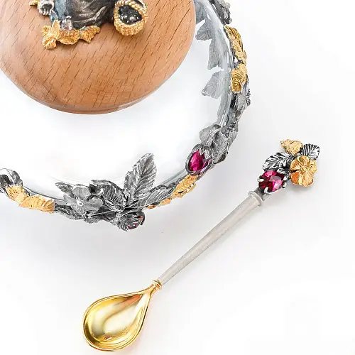 Серебро 925° — средний вес 119 г. Термостойкое стекло. Вставки: 7 корунд-рубинов