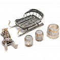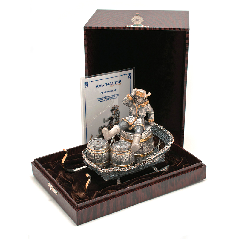 Подарок премиум-класса полностью ручной работы. Набор для специй, состоящий из солонки, перечницы и одной универсальной столовой ёмкости (можно использовать под горчицу), выполнен в виде деревянной телеги. Работа получилась интерактивной – колеса и оси телеги крутятся и поворачиваются. Все элементы легко снимаются. Набор упакован в фирменный подарочный футляр и транспортную коробку.
