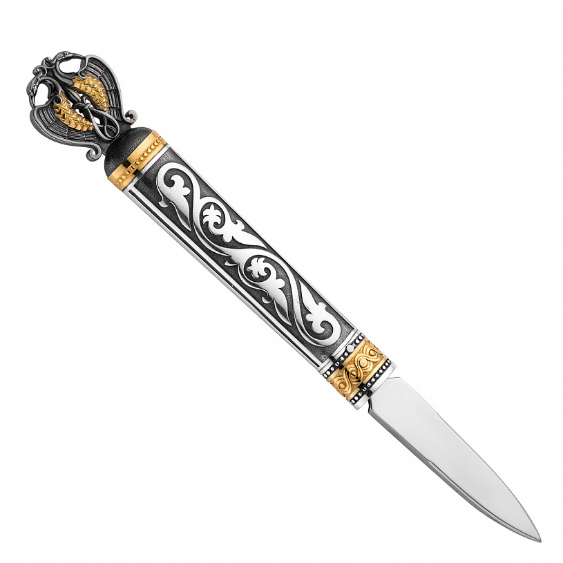 Основная особенность такого прибора – его великолепный внешний вид, которого смогли добиться опытные мастера, расписывая ножик вручную. Именно поэтому на рукояти красуется непревзойденный орнамент, выполненный в технике художественной гравюры. Золотые и серебрянные вставки гармонично дополняют композицию и делают столовый прибор настоящим произведением искусства.