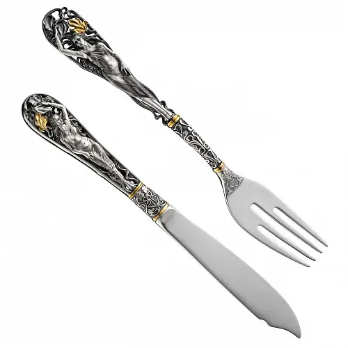 Сувенирные столовые приборы прекрасно украшают праздничный стол и будут уместны во время любого торжества. Серебряный нож “Гармония” – великолепное творение ручной работы, которое станет отличным подарком на свадьбу, день рождения или годовщину. Восхитительное изделие изготовлено из чистого серебра 925 пробы. Продолговатое лезвие не слишком острое, поэтому отлично подойдет для нарезки мяса, рыбы или других лакомств. Великолепная рукоять расписана вручную. На поверхности изображена прекрасная девушка с длинными волосами, вокруг которой виднеются серебряные и золотые лепестки розы. Это изображение символизирует гармонию и умиротворенность. Завершает величественный ансамбль уникальный орнамент на ноже, выполненный по современной технологии гравюры.