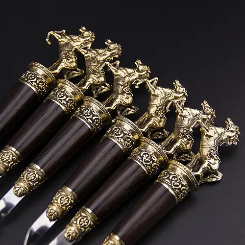 Нож охотничий из высоколегированной нержавеющей стали, рукоятью из венге и ювелирного литья мельхиора