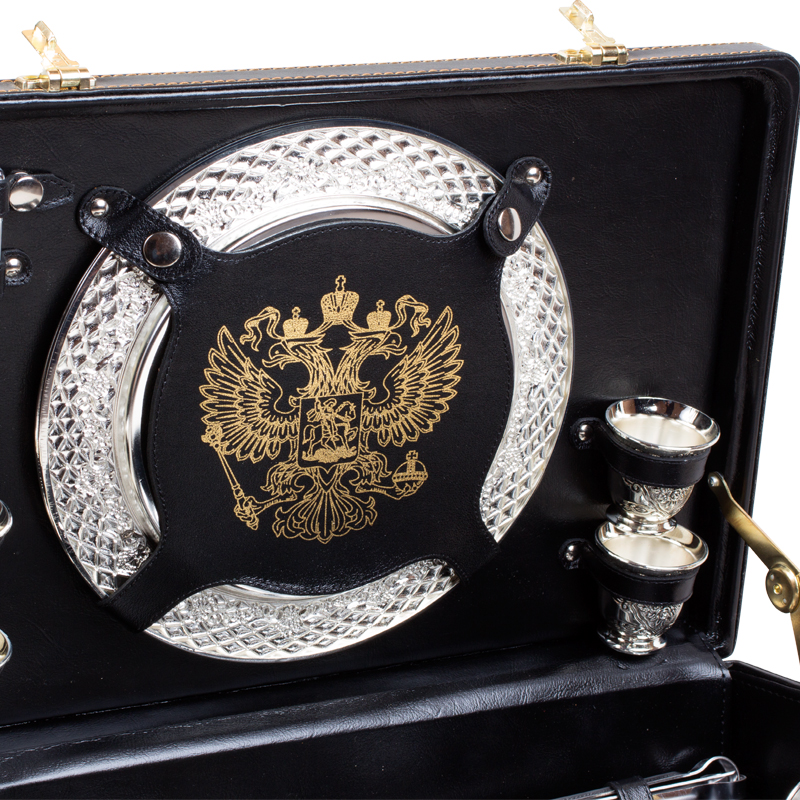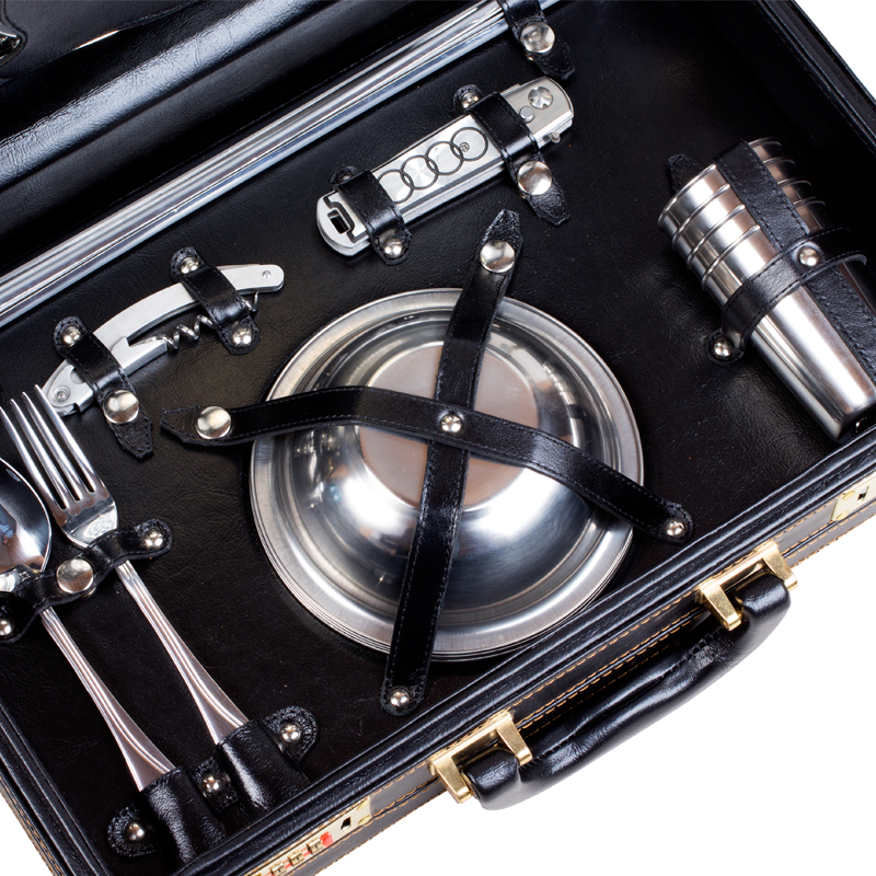 Кейс из искусственной кожи, вилки из нержавеющей стали - 4 шт., ложки из нержавеющей стали - 4 шт., стопки из стали с никель-серебряным покрытием - 4 шт., блюда для закусок из стали с никель-серебряным покрытием - 2 шт., шампуры из нержавеющей стали - 4 шт., нож складной из нержавеющей стали, тарелки из нержавеющей стали - 4 шт., стаканы из нержавеющей стали - 4 шт., зажигалка, штопор-сомелье.