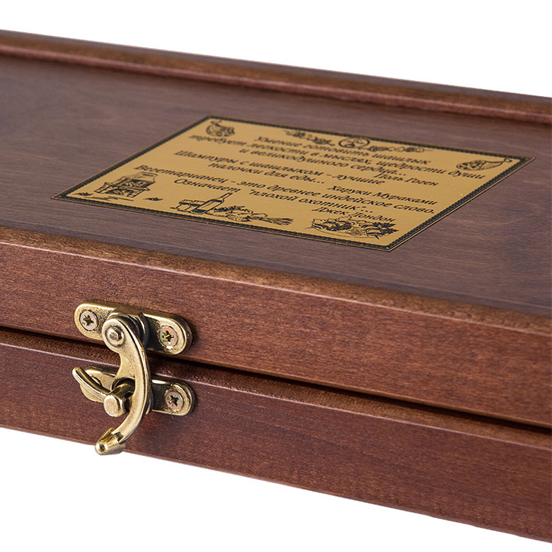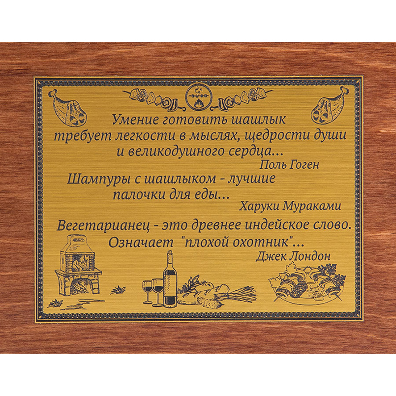 На внешней и внутренней стороне крышки размещены два металлизированных шильда с признаниями великих людей в любви к мясу, приготовленному на таких замечательных шампурах и уложенных в такой стильный и удобный кейс. Размер шильда - 18 х 9 см.