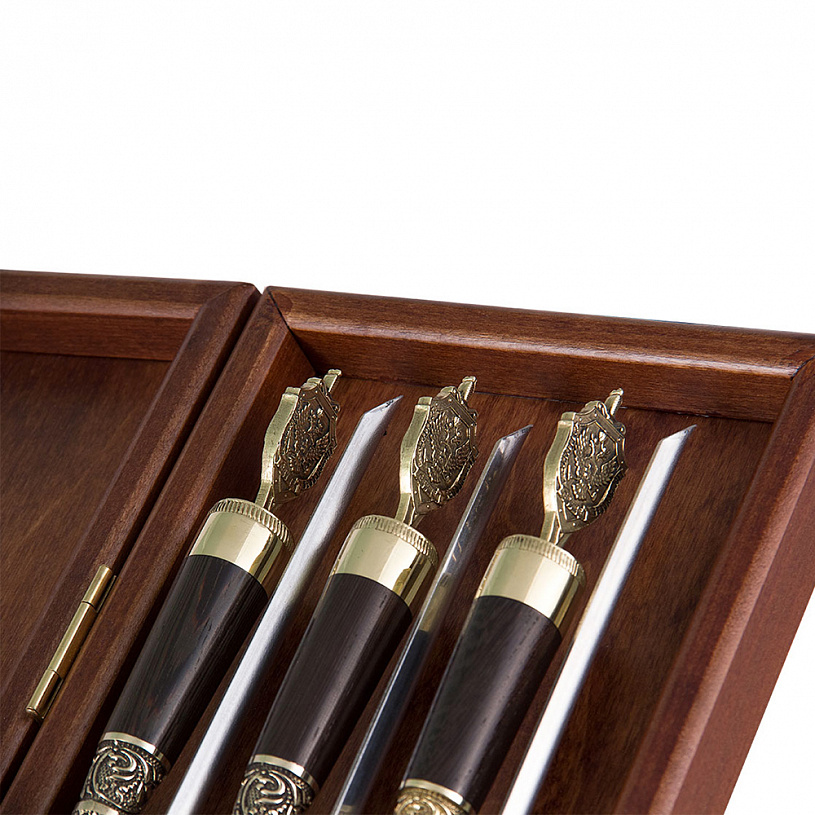 Набор шампуров "ФСБ" с навершиями в виде герба ФСБ в деревянном кейсе.