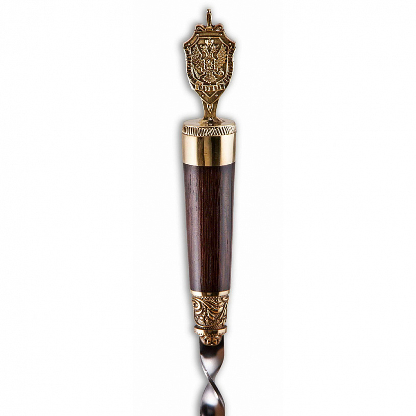 Материал шампура: нержавеющая сталь. Деревянные (дерево венге) ручки с навершиями из латуни точного художественного литья.