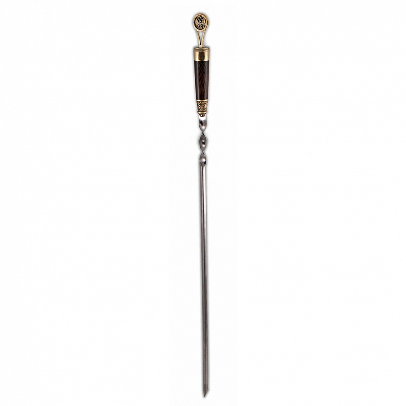 Материал шампура: нержавеющая сталь. Деревянные (дерево венге) ручки с навершиями из латуни точного художественного литья.