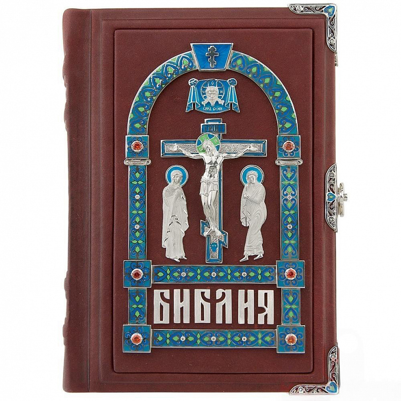 Переплет книги: кожа натурального дубления с сохраненной естественной фактурой. Обрамление: серебро 925° — средний вес 140 г. Вставки: цирконий — 7 камней. Эмаль.