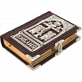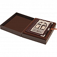 Переплет книги изготовлен из натуральной телячьей кожи. Обрамление: серебро 925° — средний вес 160 г. Вставки: цирконий — 9 камней.