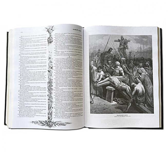 Подарочное издание в переплете из натуральной кожи ручной работы с трехсторонним золотым обрезом. Книга оформлена фотопечатью на коже с репродукцией гравюры Гюстава Доре «Пригвождение ко кресту».