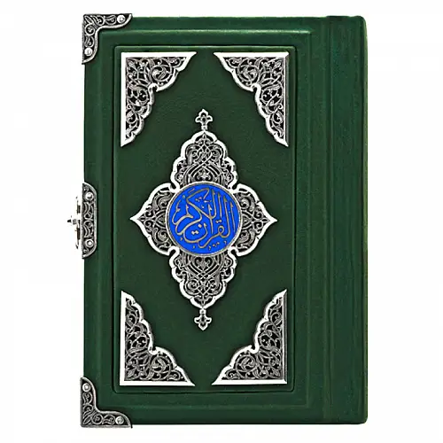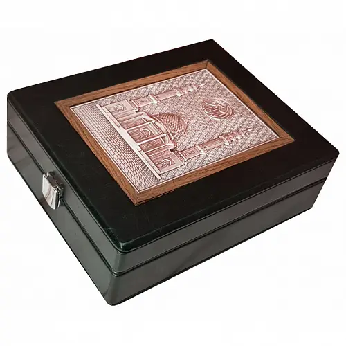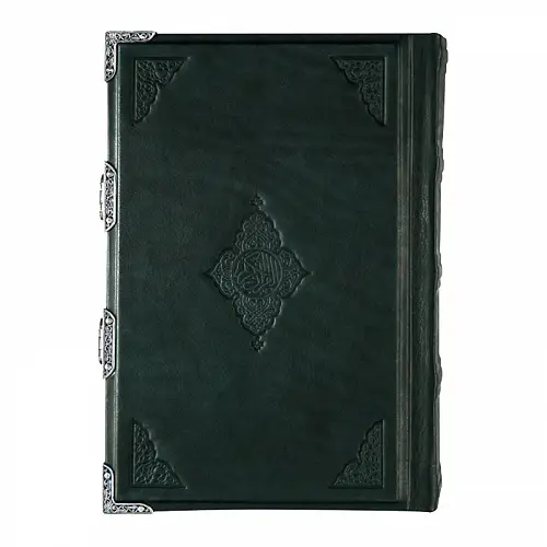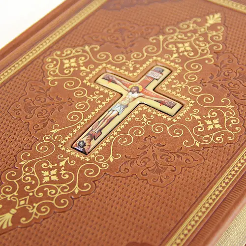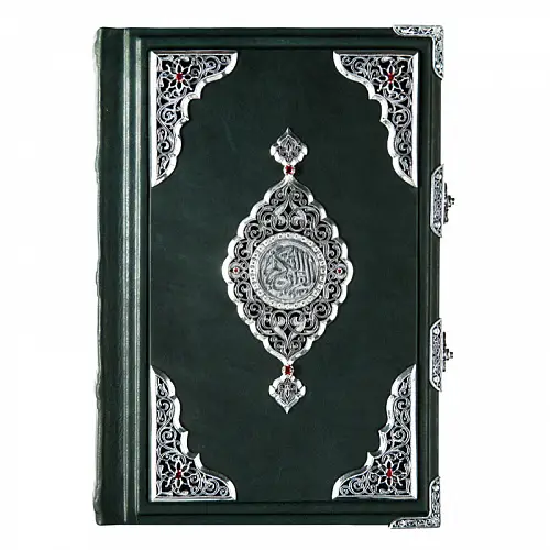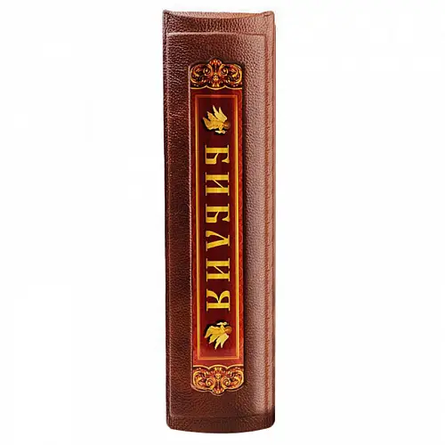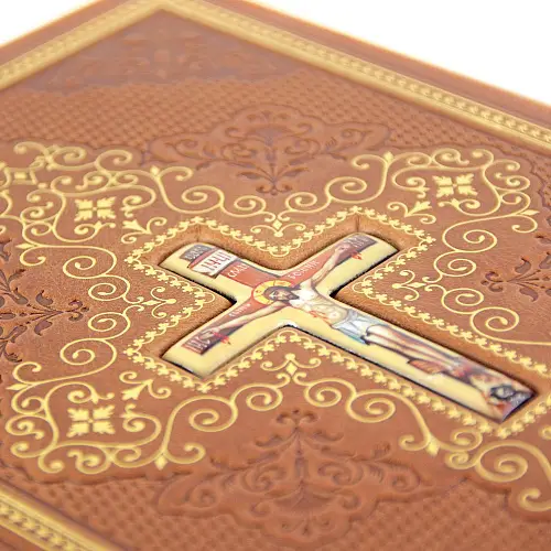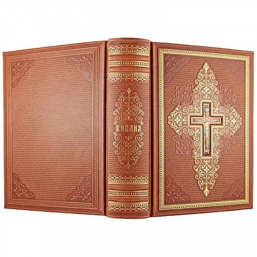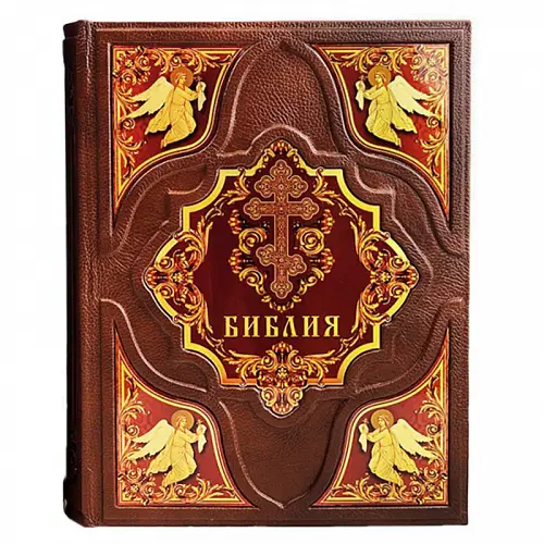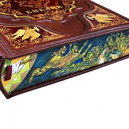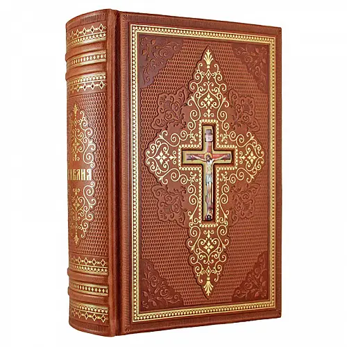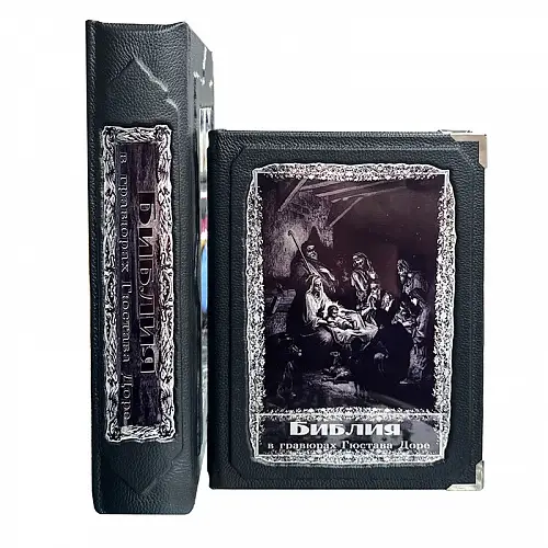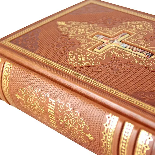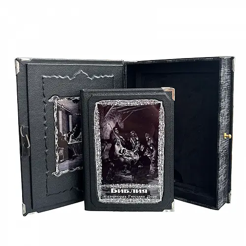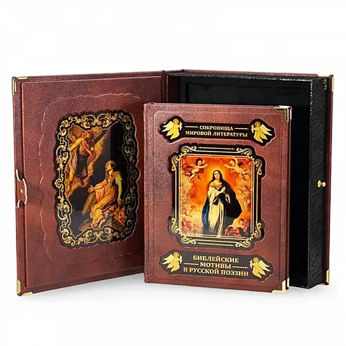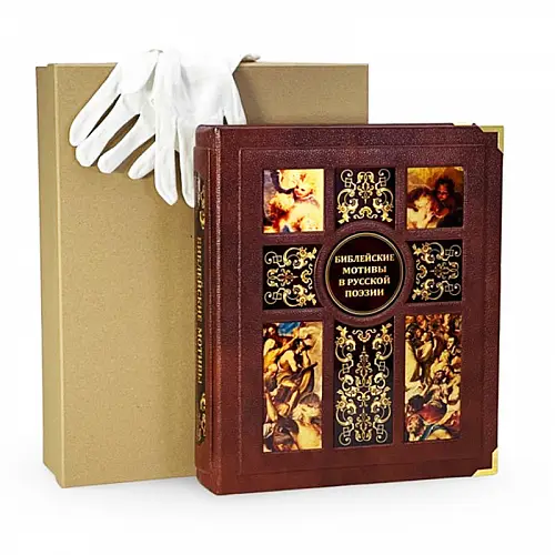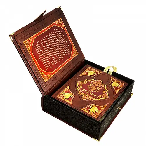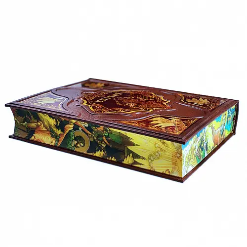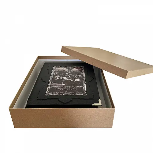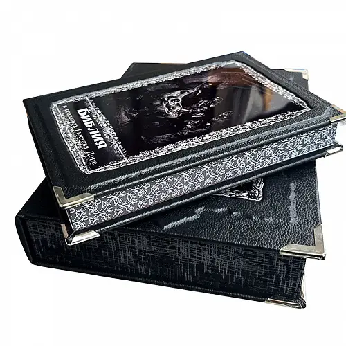 Кожаный тисненый переплет ручной работы с художественными вставками, металлические уголки. Исполнение в оригинальной кожаной подарочной коробке с художественными накладками.