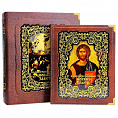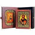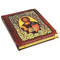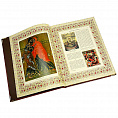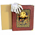 Кожаный тисненый переплет ручной работы с художественными вставками, металлические уголки. Исполнение в оригинальной кожаной подарочной коробке с художественными накладками.
