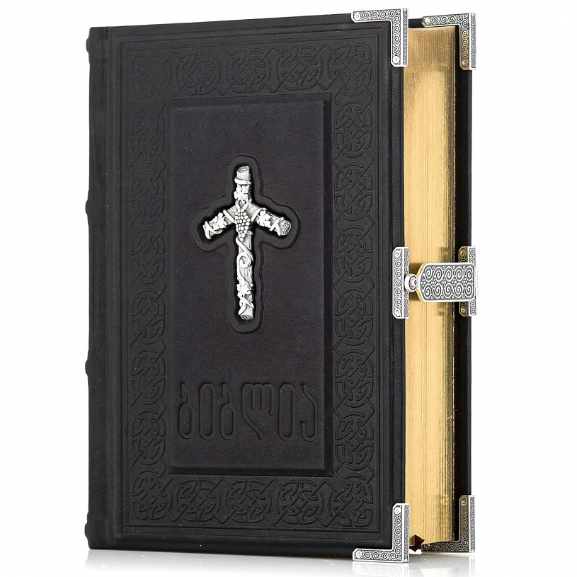Переплет Библии изготовлен вручную из телячьей кожи натурального дубления с сохраненной естественной фактурой. Серебро 925° — средний вес 68 г.