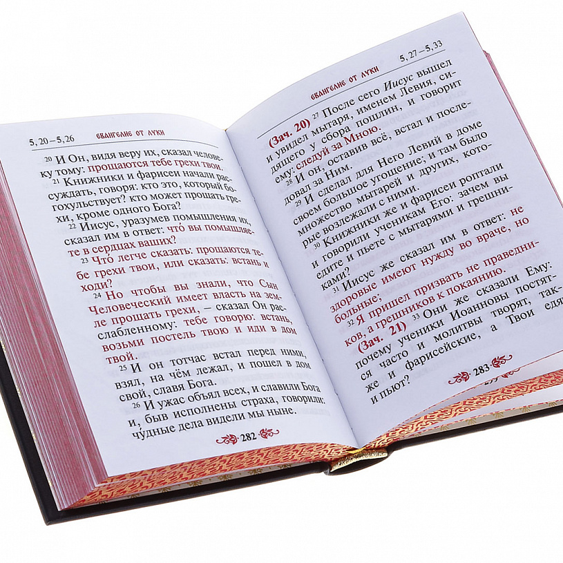 Святое Евангелие крупным шрифтом с выделением слов Спасителя красным цветом, что является удобным решением для восприятия священного текста.