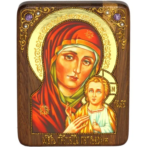 Икона "Божией Матери "Петровская" на мореном дубе с нимбом из сусального золота в березовом киоте