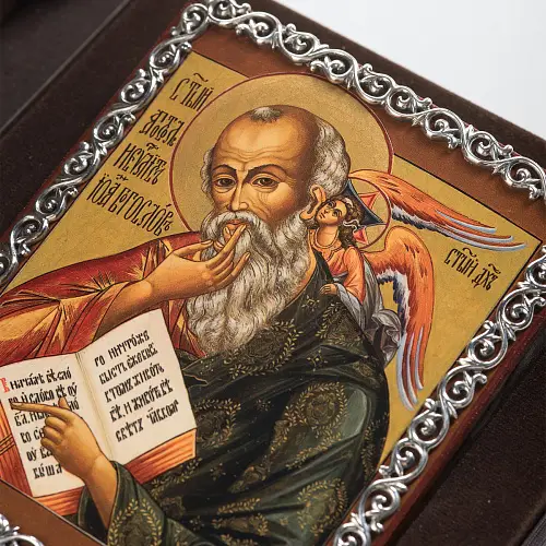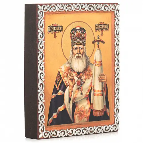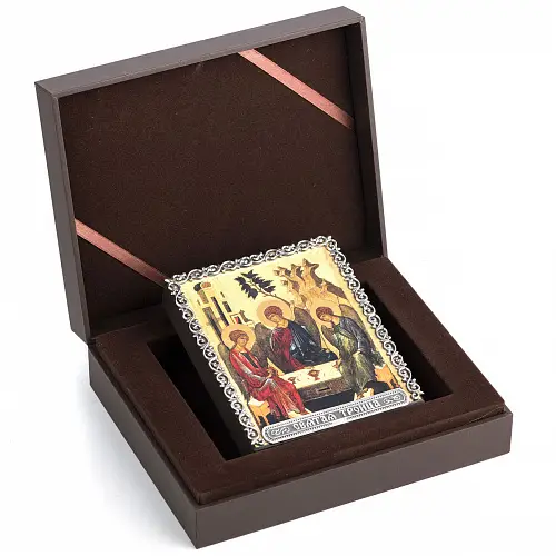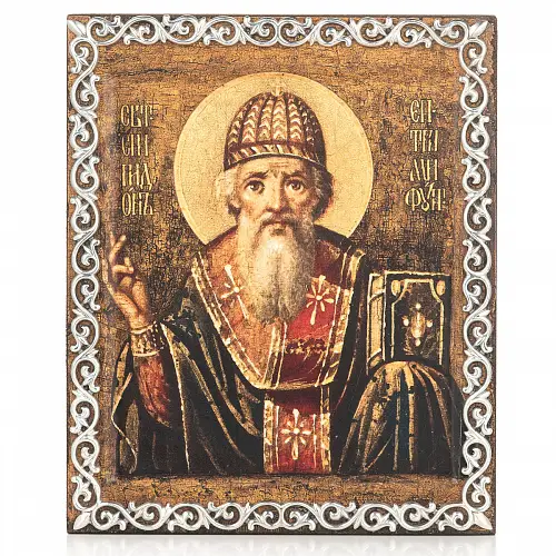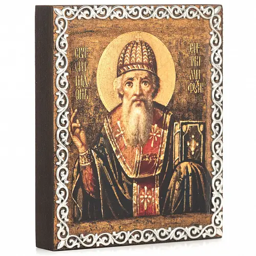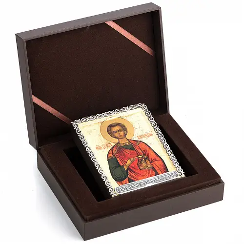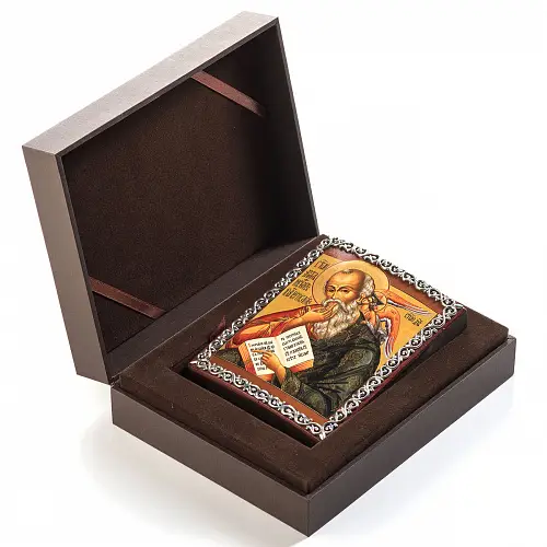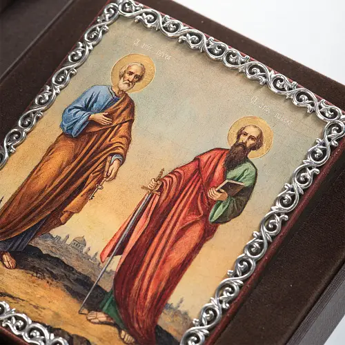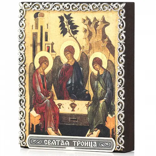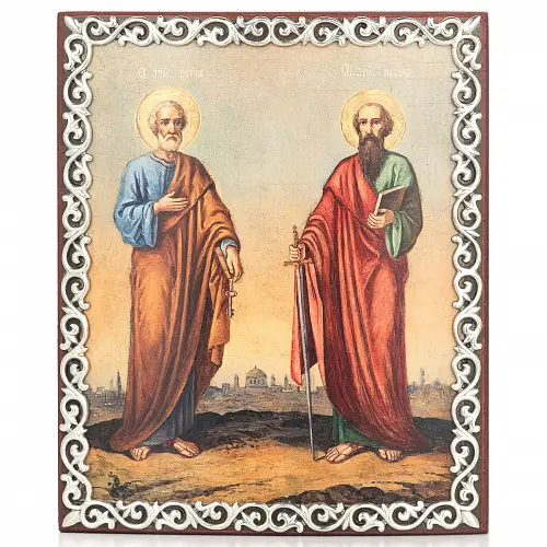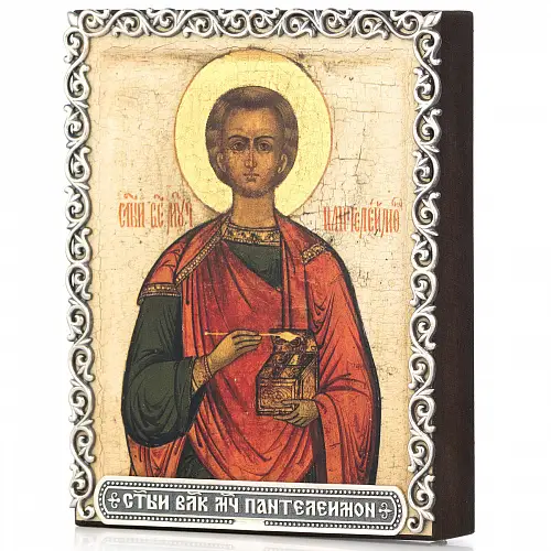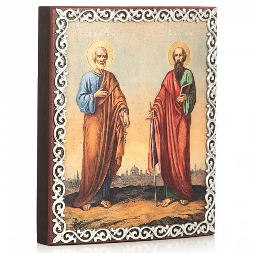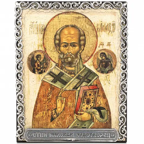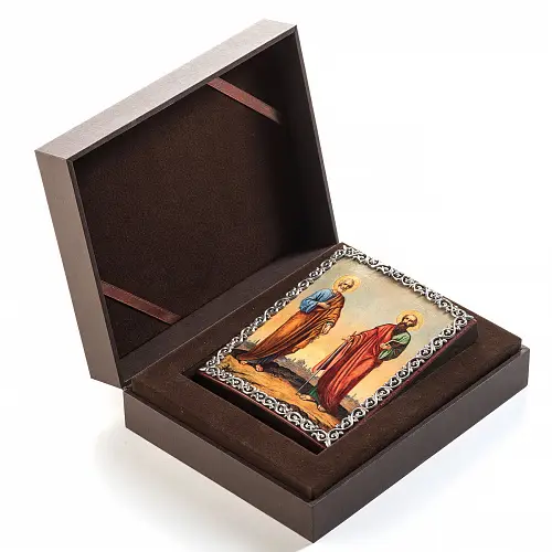 Изображение на иконной доске из липы нанесено прямой печатью по левкасу и покрыто лаком. Нимбы позолочены сусальным золотом. Применен эффект старения — трещинки, патина.