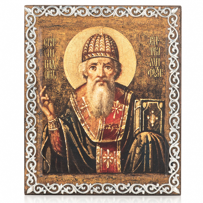 Изображение на иконной доске из липы нанесено прямой печатью по левкасу и покрыто лаком. Нимбы позолочены сусальным золотом. Применен эффект старения — трещинки, патина.