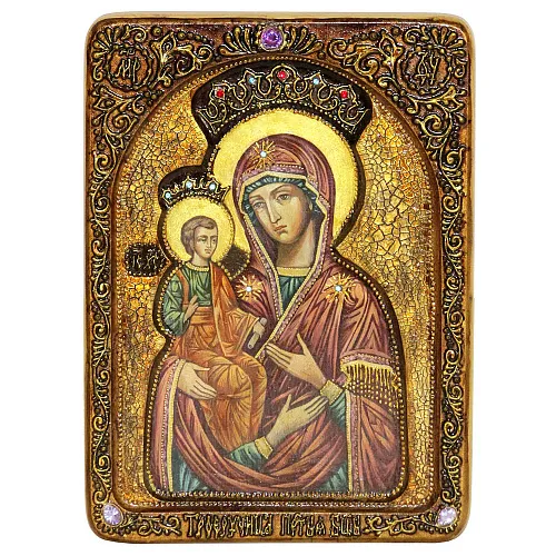 Тело иконы сделано из массива сакрального кипариса с выборкой двойного ковчега. Поля иконы и венцы оформлены русским орнаментом и украшены натуральными полудрагоценными камнями. Образ писан вручную темперными красками. Письмо соблюдено православными канонами школы Русской живородной иконописи конца 18 - начала 20 веков. Окончательно икона оформлена специальными грунтами и лаками. Все работы по оформлению делались вручную.