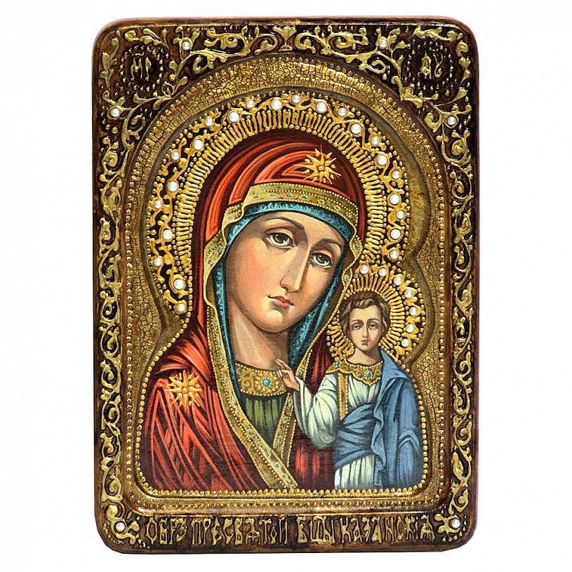Тело иконы сделано из массива сакрального кипариса с выборкой двойного ковчега. Поля иконы и венцы оформлены русским орнаментом и украшены натуральным жемчугом.