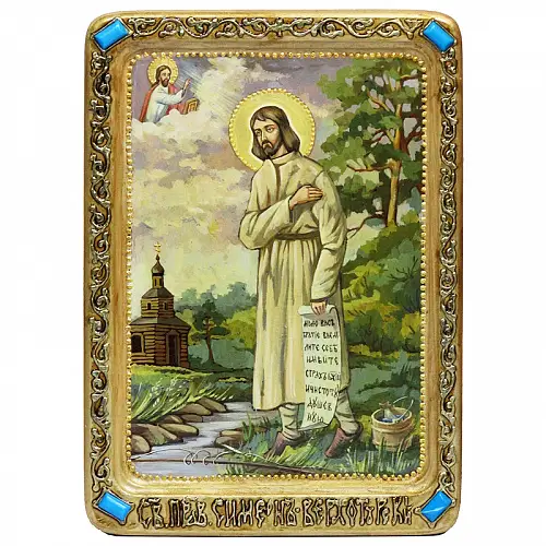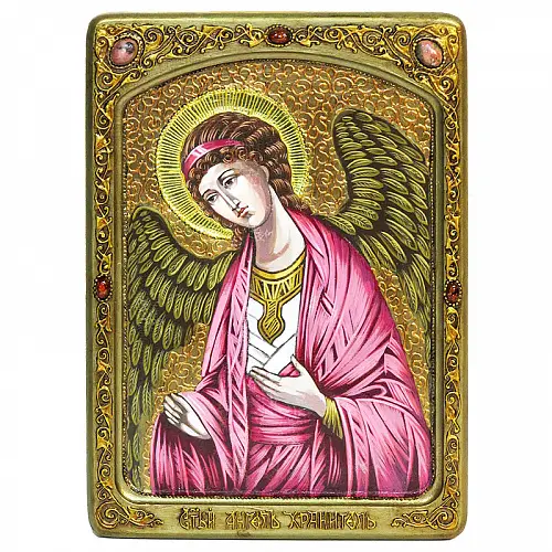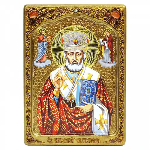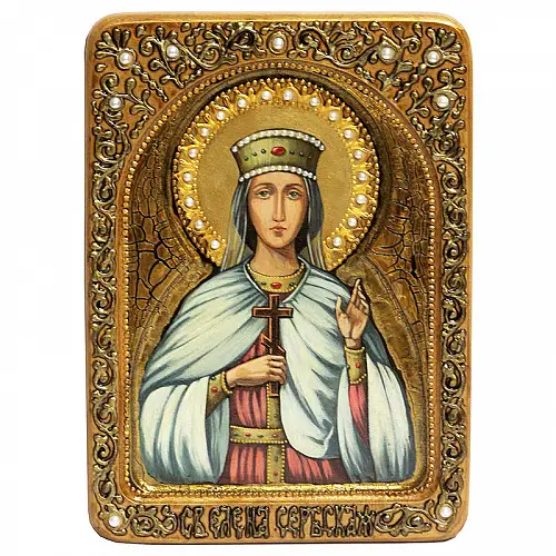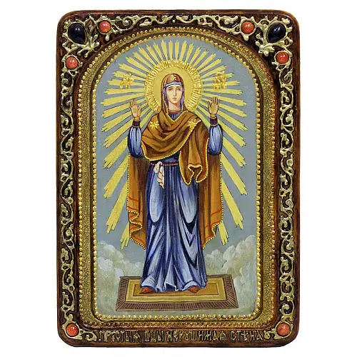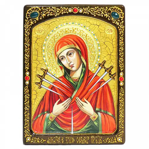 Тело иконы сделано из массива сакрального кипариса с выборкой двойного ковчега. Икона покрыта сусальным золотом и украшена вручную художником позолотчиком. Поля иконы и венцы оформлены русским орнаментом и украшены натуральным жемчугом. Образ писан вручную темперными красками. Письмо соблюдено православными канонами школы Русской живородной иконописи конца 18 - начала 20 веков. Окончательно икона оформлена специальными грунтами и лаками. Все работы по оформлению делались вручную. К каждой иконе прилагается номерное свидетельство с полной информацией о ней. Каждая икона поставляется в подарочной шкатулке.