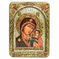 Тело иконы сделано из массива сакрального кипариса с выборкой двойного ковчега. Поля иконы и венцы оформлены русским орнаментом и украшены натуральным авантюрином, сердоликом и фианитом.