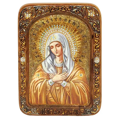 Тело иконы сделано из массива сакрального кипариса с выборкой ковчега. Икона покрыта сусальным золотом и украшена вручную художником позолотчиком. Поля иконы и венцы оформлены русским орнаментом и украшены натуральным янтарём и нефритом. Образ писан вручную темперными красками. Письмо соблюдено православными канонами школы Русской живородной иконописи конца 18 - начала 20 веков. Окончательно икона оформлена специальными грунтами и лаками. Все работы по оформлению делались вручную.