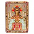 Тело иконы сделано из массива сакрального кипариса с выборкой двойного ковчега. Поля иконы и венцы оформлены русским орнаментом и украшены натуральным авантюрином и родонитом.