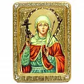 Тело иконы сделано из массива сакрального кипариса с выборкой двойного ковчега. Поля иконы и венцы оформлены русским орнаментом и украшены натуральными полудрагоценными камнями.