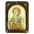 Тело иконы сделано из массива сакрального кипариса с выборкой двойного ковчега. Поля иконы и венцы оформлены русским орнаментом и украшены натуральными полудрагоценными камнями. Образ писан вручную темперными красками. Письмо соблюдено православными канонами школы Русской живородной иконописи конца 18 - начала 20 веков. Окончательно икона оформлена специальными грунтами и лаками. Все работы по оформлению делались вручную.