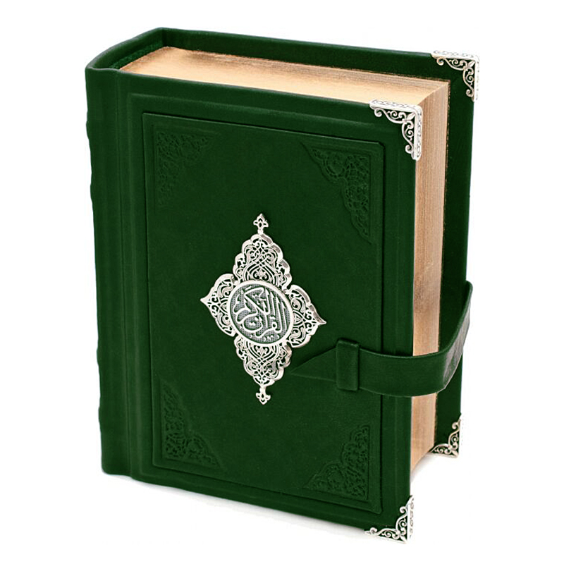 Оригинальное издание Священного Корана на арабском языке выполнено в окладе из слиткового серебра. Переплет из тонкой телячьей кожи глубокого зеленого цвета вручную инкрустирован объемными серебряными вставками и расписан в технике горячей эмали. Обрамление: серебро 925° — средний вес 50 г. Вставки: цирконий — 1 камень. На замке книги стоят клейма мастерской и пробирной палаты.
