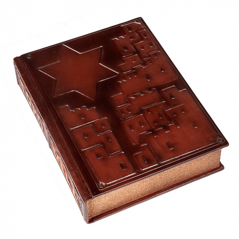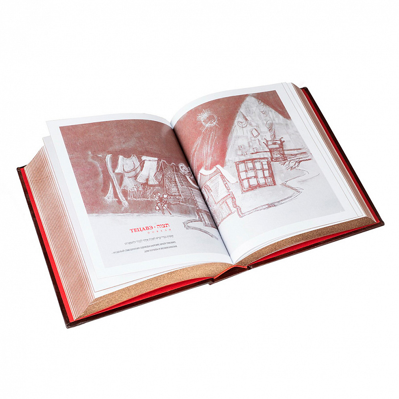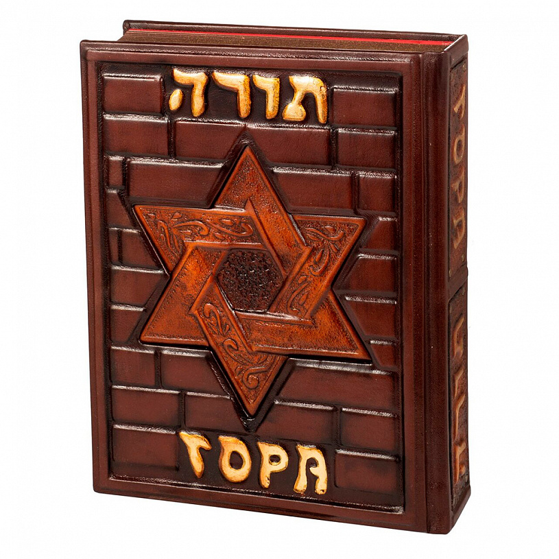 Богатое тиснение выполнено на коже двух видов дубления: растительного и традиционного. Звезда Давида с орнаментом изображена на обложке. Фоном для нее служит тиснение по коже в виде каменной кладки — стилизованной Стене Плача. На обороте кожаного переплета оттеснены очертания Древнего Иерусалима. Корешок украшен объемным тиснением. Название книги указано на двух языках и выделено золотым цветом. Им же окрашен обрез книги. Переплет Торы из натуральной кожи выполнен вручную, защищает страницы от истирания.
