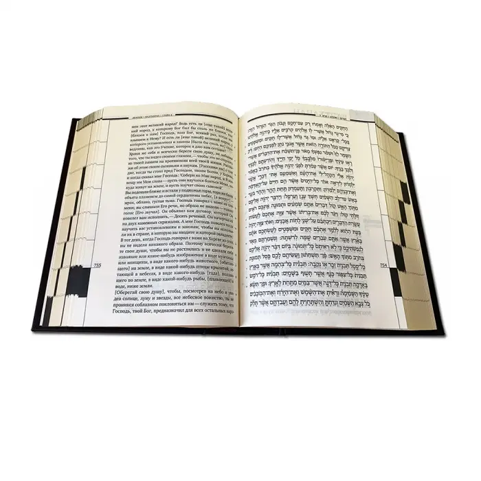 Подарочное издание в кожаном переплете ручной работы с трехсторонним серебряным обрезом. В качестве оформления использована филигрань ручной работы, покрытая серебром гальваническим способом, натуральные топазы. На двух языках: русском и иврите.