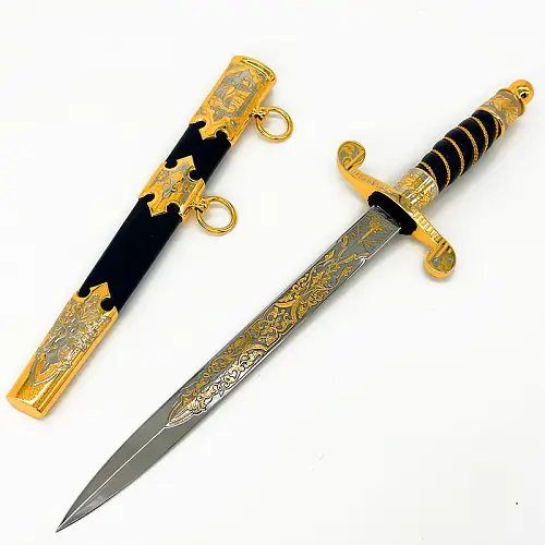 Златоустовская гравюра популярна для всех ценителей роскошных коллекционных вещей. Именно поэтому кортик адмиральский “Петр Первый” Златоуст станет прекрасным подарком на годовщину службы, юбилей, день рождения или свадьбу офицера, военного человека. Потрясающее сувенирное оружие, изготовленное из стали высокого качества с латунным и никелевым сплавом, станет истинным украшением праздника. Изделие покрыто блестящей эмалью и красивым орнаментом в виде растений. На ножнах красуется великолепное изображение великого царя Петра Первого, что только подчеркивает изысканность кортика. Такой подарок выглядит элегантно и станет отменным дополнением образа настоящего офицера.