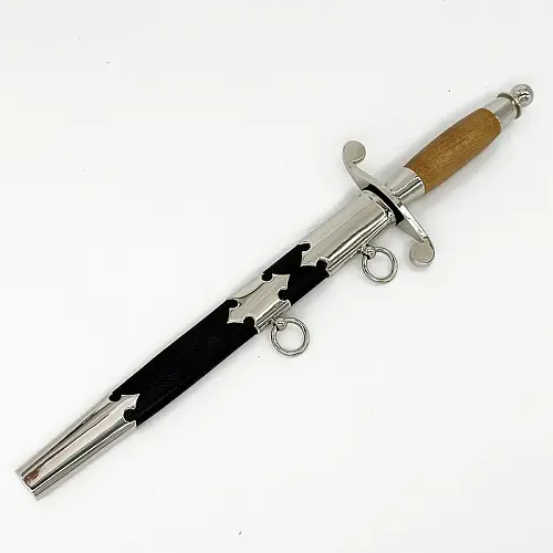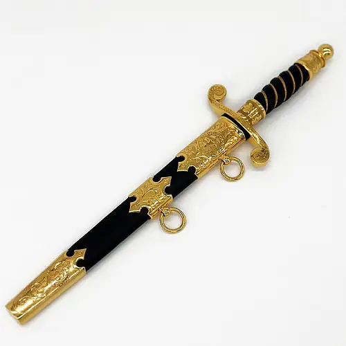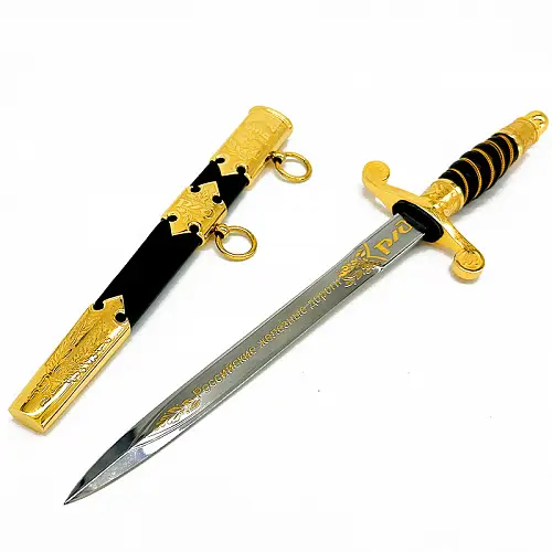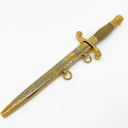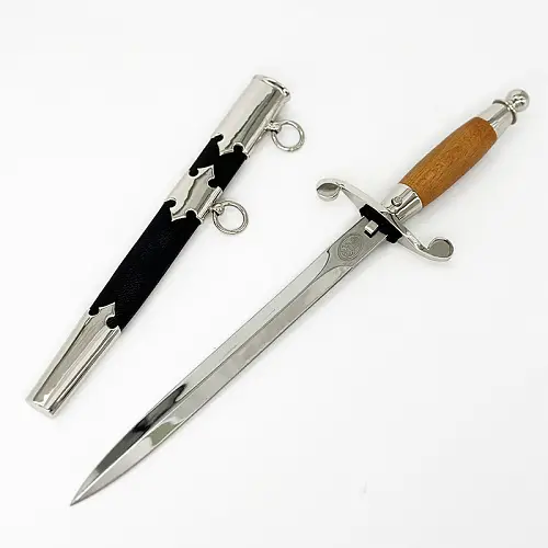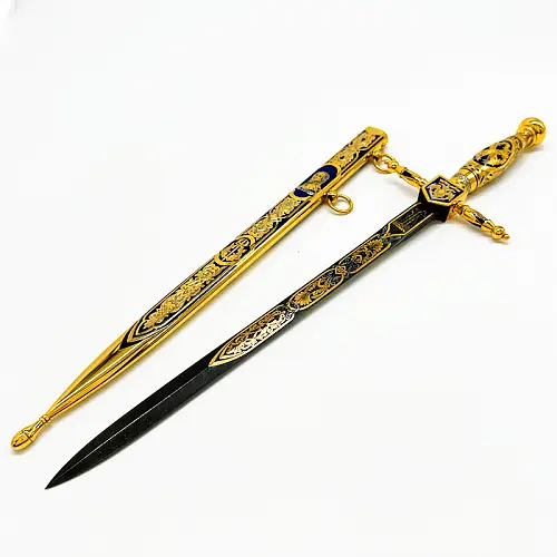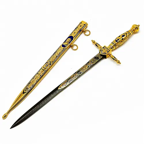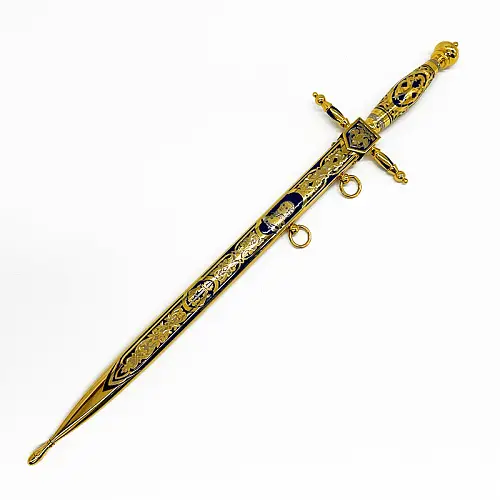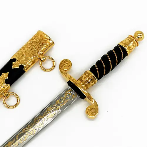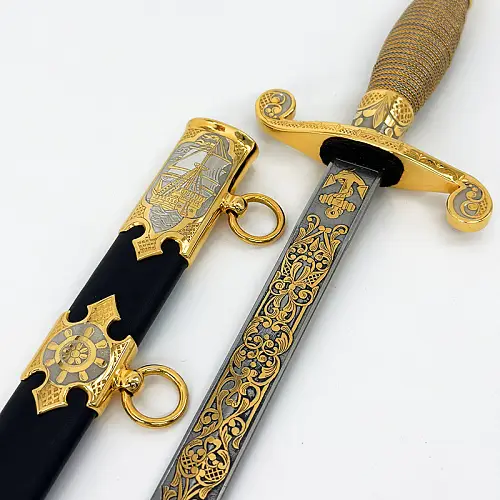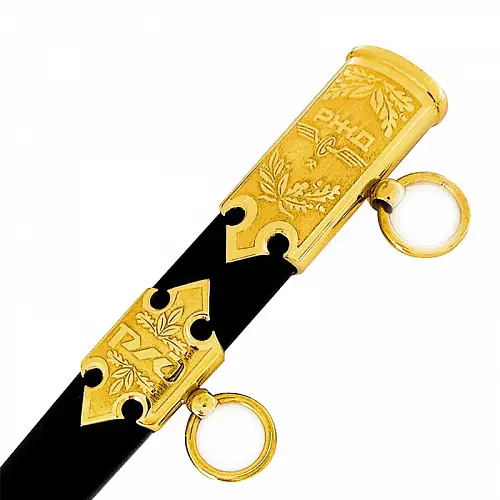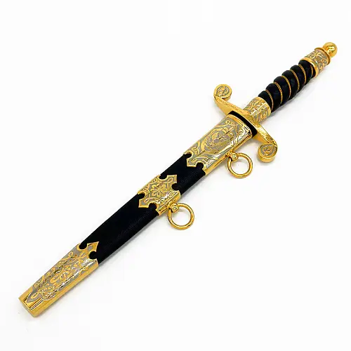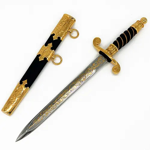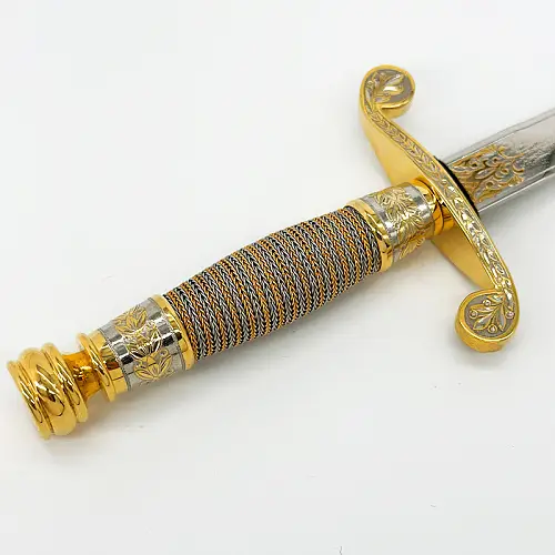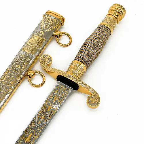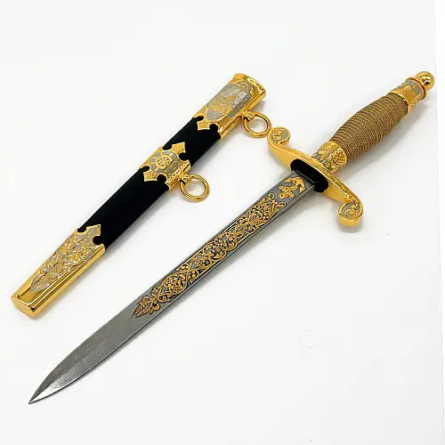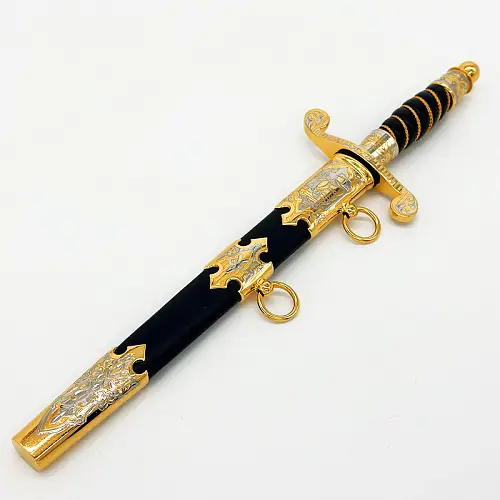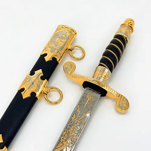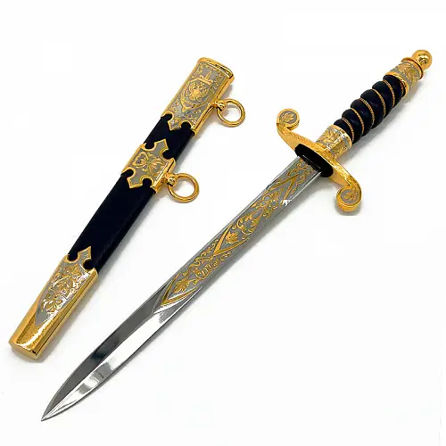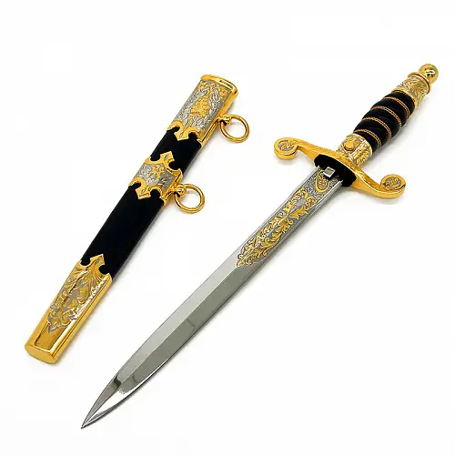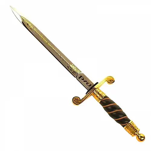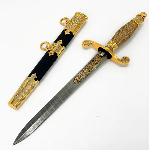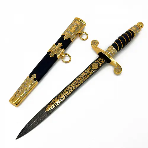 Лучший подарок офицера – коллекционное оружие, изготовленное из высококачественной дамасской стали с гравировкой “Высшая цель – служение отечеству”. Твердый металл потрясающего серебристого цвета сочетает в себе прочность и элегантность, а орнамент в виде листьев и гравировка добавляют предмету роскоши и уникальности. Лезвие изготовлено из нескольких тонких металлических пластин, что обеспечивает ему прочность и долговечность. Черная бархатная рукоять украшена позолоченным орнаментом, как и ножны, в которые прячут лезвие. Кортик из дамасской стали “ФСБ” Златоуст украшен неповторимыми рисунками, что делает изделие настоящим произведением искусства, а его владельцу добавляет статус и благородство. Для его производства используется современное оборудование и инновационные техники изготовления ножей.