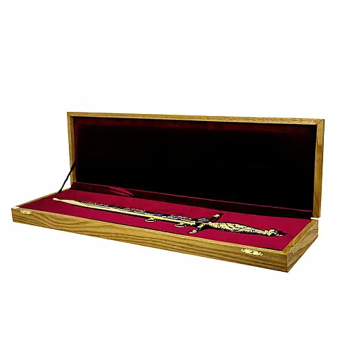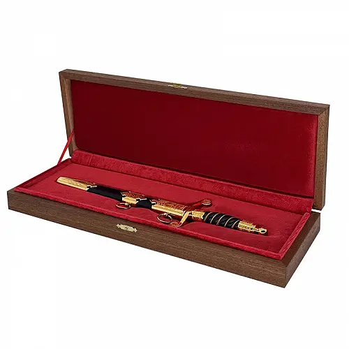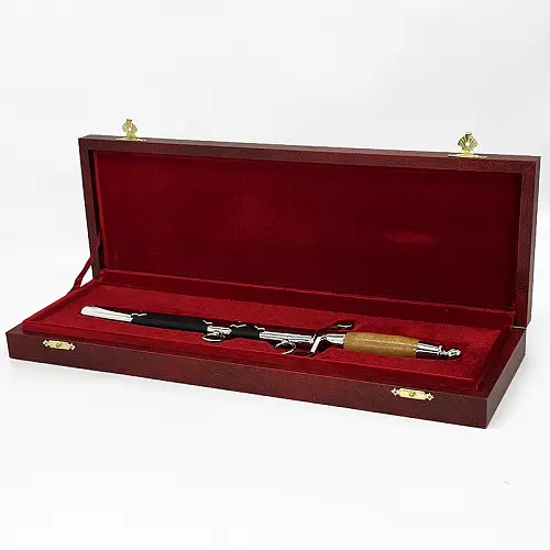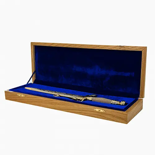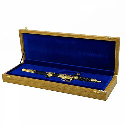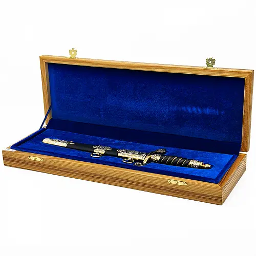 Коробка из натурального дерева внутри обитая синим бархатом – идеальное хранилище для коллекционного оружия, что является прекрасной упаковкой для презента. Такой подарок выглядит дорого и изысканно, поэтому сможет добавить элегантности каждому офицеру.