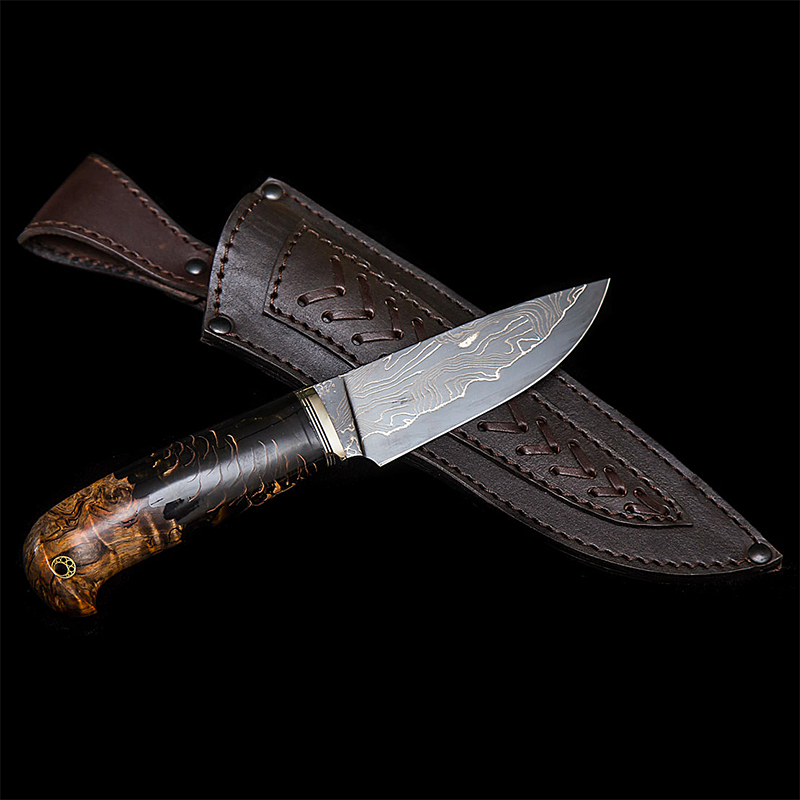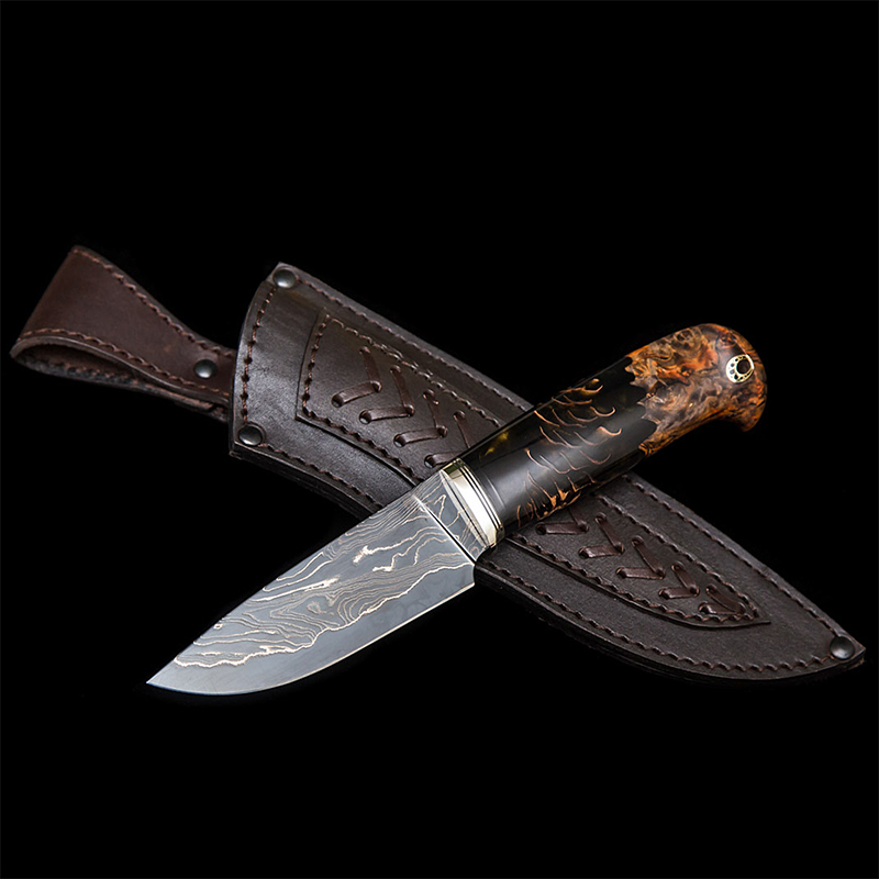 Нож из ламинированной стали «Соболь»,рукоять притин мельхиор, композит (натуральная шишка в акриле+стабилизированная карельская берёза), дополнен натуральными ножнами из телячьей кожи – это стильный и функциональный нож, созданный вручную кузнецами из города Ворсма. Ламинированная сталь твердость 60-61 HRC.Сталь не коррозионностойкая, подвержена коррозии. Удобная форма и сквозной монтаж обеспечивают комфортное использование. Этот нож – лучший подарок для себя и близких! Модель ножа может быть одна, но цвет, насыщенность и фактурный рисунок дерева на рукояти или композита всегда уникальны. Каждый нож будет неповторимым!