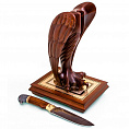 Нож на подставке “Сокол” златоуст изготовлен из дамасской стали, которая высоко ценится во всем мире. Изделия из нее прочные и острые, не требующие заточки на протяжении многих лет.