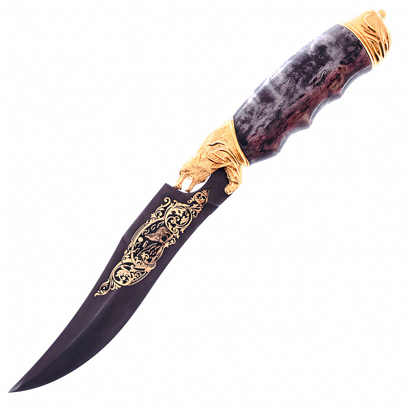 Нож “Волк” златоуст был создан из самой красивой стали в мире. Узоры, украшающие клинок изделия, нельзя увидеть ни на каком другом материале. Дамасская сталь удивительный сплав, из него получаются острые, крепкие и долговечные ножи.