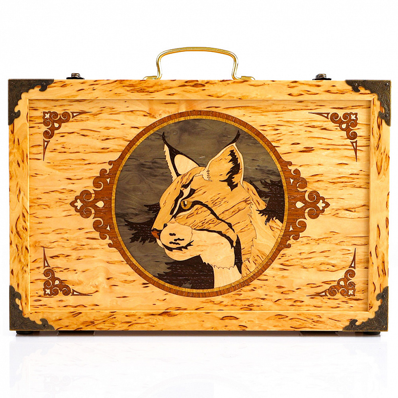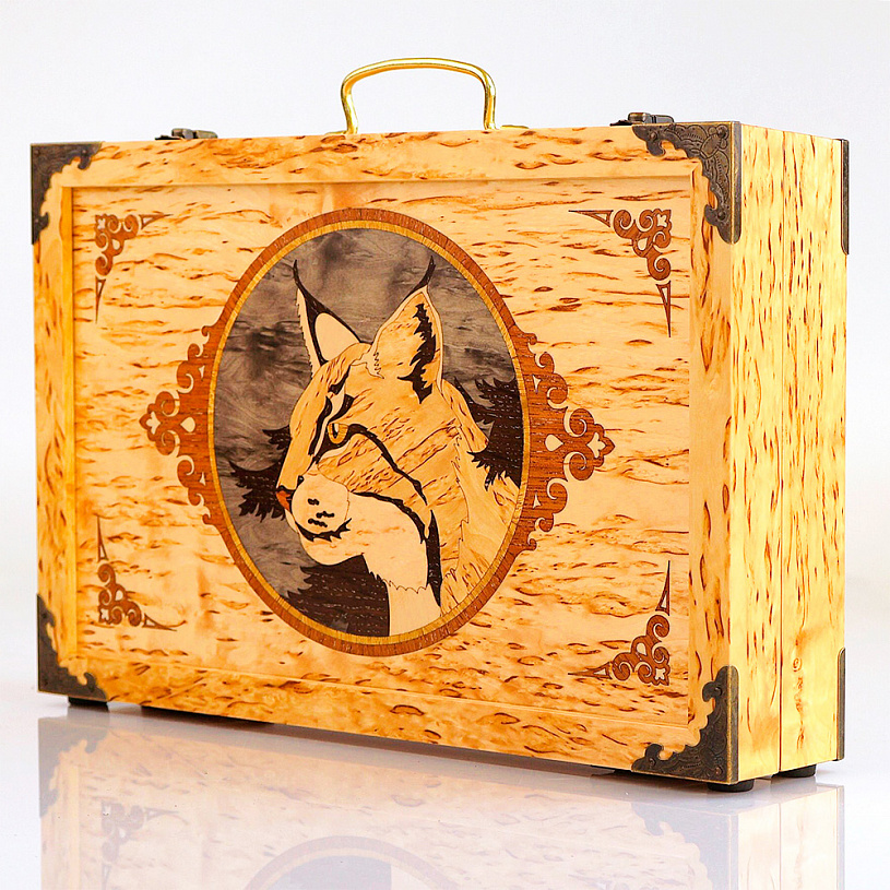 Массив и шпон карельской берёзы. Рисунок на крышке изготовлен в технике маркетри (деревянная мозаика) — шпон ценных пород деревьев: палисандр, эвкалипт, оливковое дерево.