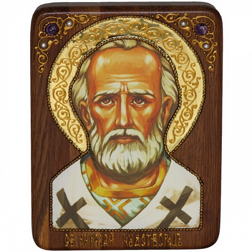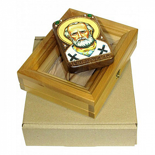 Икона "Святитель Николай чудотворец" на мореном дубе с нимбом из сусального золота в березовом киоте